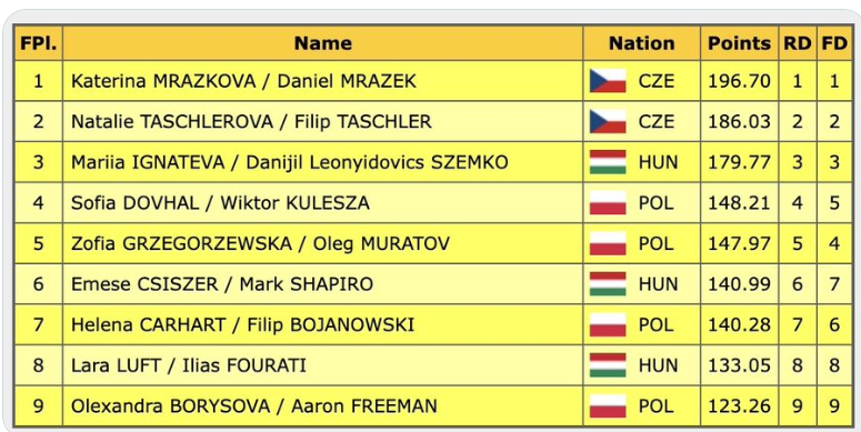 Второе место на четырех национальных чемпионатах (Чехия, Польша, Венгрия, Словакия). Общая сумма баллов 186, отставание от пары Мразеков составляет 10 баллов. Они опережают венгерскую пару Игнатьеву/Семко на 7 баллов; венгерские фигуристы заняли 24-е место на чемпионате мира и исполняют свою старую программу под музыку из фильма «Харли Квинн».