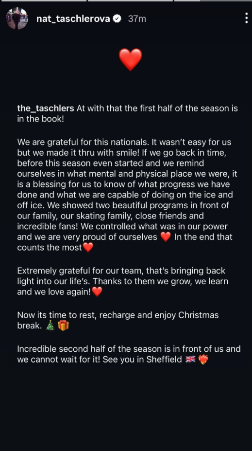 Мы благодарны за этот чемпионат страны. Нам было нелегко, но мы справились с улыбкой! Если вернуться назад, до начала этого сезона, и вспомнить, в каком моральном и физическом состоянии мы находились, то для нас это настоящее благословение — осознавать, какого прогресса мы достигли и на что мы способны на льду и вне его. Мы показали две прекрасные программы перед нашей семьей, нашей фигурнокатательной семьей, близкими друзьями и невероятными болельщиками! Мы контролировали то, что было в наших силах, и мы очень гордимся собой. В конце концов, это самое главное.