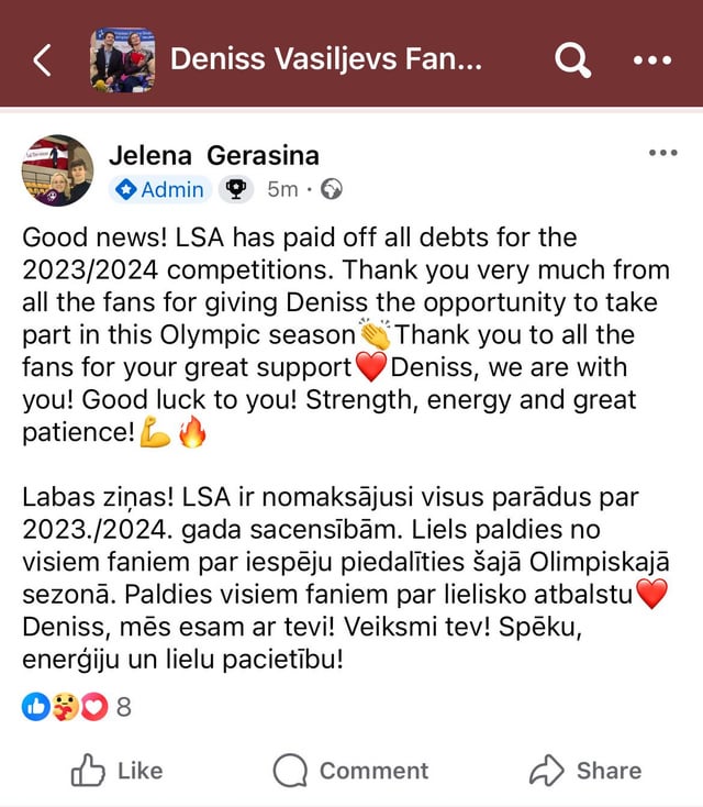 Я нахожусь в неподходящей форме для начала олимпийского сезона. Продолжающиеся проблемы с Латвийской Федерацией Фигурного катания сильно давили на меня в последние месяцы и мешали моей подготовке, истощая мои финансовые и ментальные ресурсы, которые для меня необходимы в этот критический момент. Частичное разрешение ситуации виднеется на горизонте, но я вынужден признать, что время уже было потеряно.